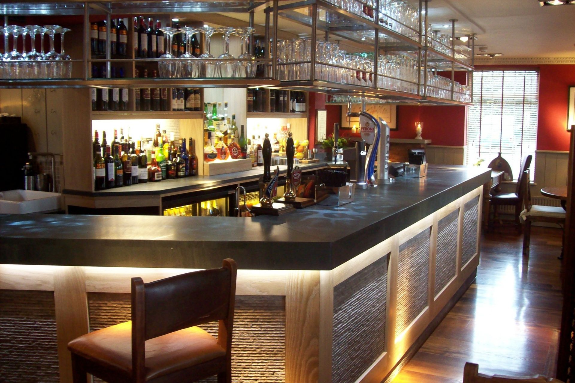 A warm space with red walls and slate bar top, designed for unwinding with friends over drinks.