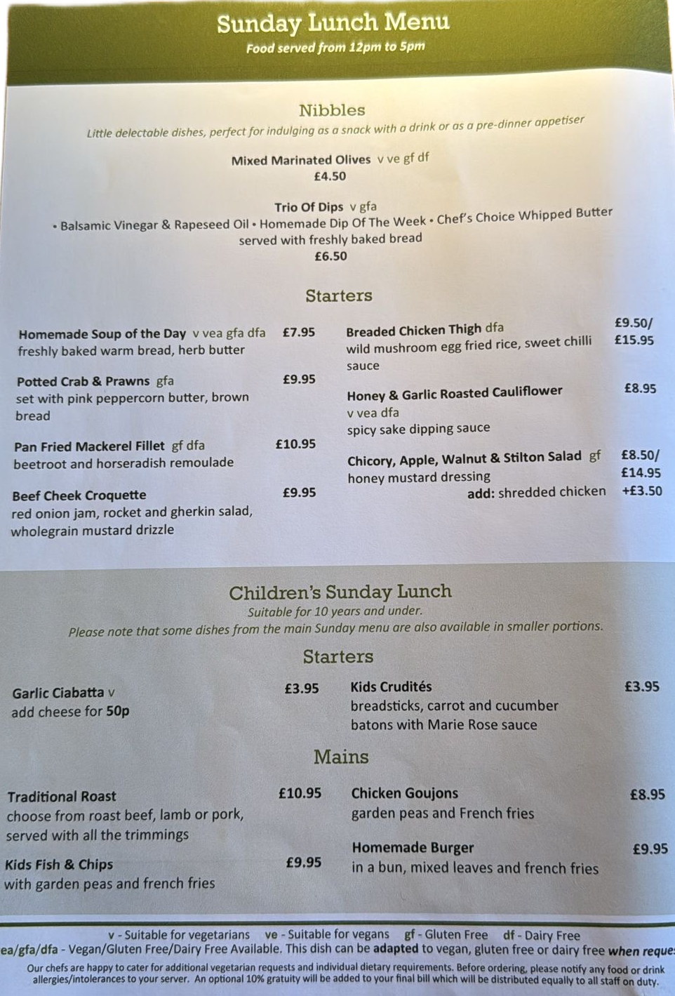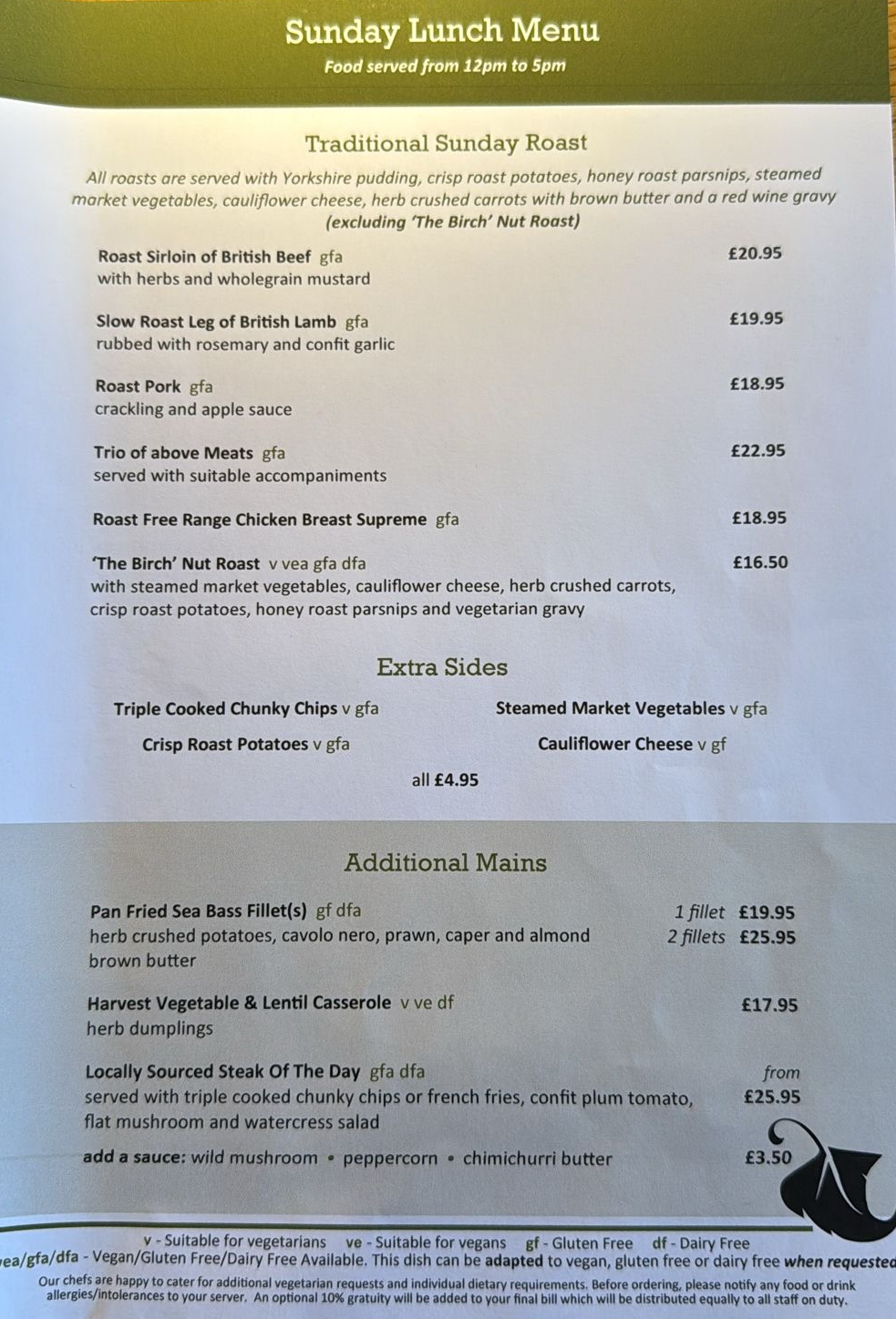 Sunday Lunch Menu